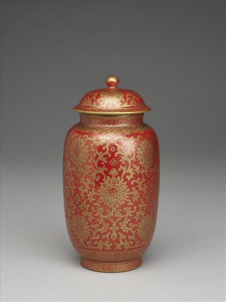 短頸筒形帶寶頂蓋罐,全器紅地描金紋飾,蓋繪纏枝番蓮紋,花心有「福」字紋飾,肩畫如意紋一周,腹部畫纏枝番蓮紋,中心紋樣為蓮花花心上書「福」字,花葉間有「卍」字紋,其下有如意,其餘番蓮花心有「卍」與「福」字紋,象徵「萬福連連」,器內與外底施淺藍色釉,底有「大清嘉慶年製」三行篆書紅款。