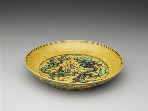 侈口,淺壁,矮圈足。薄胎骨,全器施嬌黃釉,盤心彩畫雙龍戲珠紋,外壁彩畫轉枝番蓮花。口足內外飾赭色線六道。底有赭色書「大明萬曆年製」六字二行楷款,外加雙圈。
