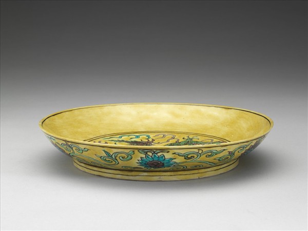 侈口,淺壁,矮圈足。薄胎骨,全器施嬌黃釉,盤心彩畫雙龍戲珠紋,外壁彩畫轉枝番蓮花。口足內外飾赭色線六道。底有赭色書「大明萬曆年製」六字二行楷款,外加雙圈。