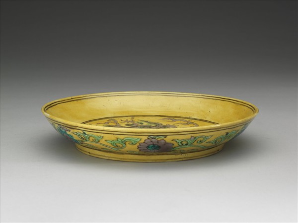 侈口,淺壁,矮圈足。薄胎骨,全器施嬌黃釉,盤心彩畫雙龍戲珠紋,外壁彩畫轉枝番蓮花。口足內外飾赭色線六道。底有赭色書「大明萬曆年製」六字二行楷款,外加雙圈。