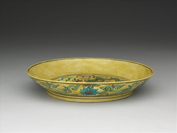 侈口,淺壁,矮圈足。薄胎骨,全器施嬌黃釉,盤心彩畫雙龍戲珠紋,外壁彩畫轉枝番蓮花。口足內外飾赭色線六道。底有赭色書「大明萬曆年製」六字二行楷款,外加雙圈。