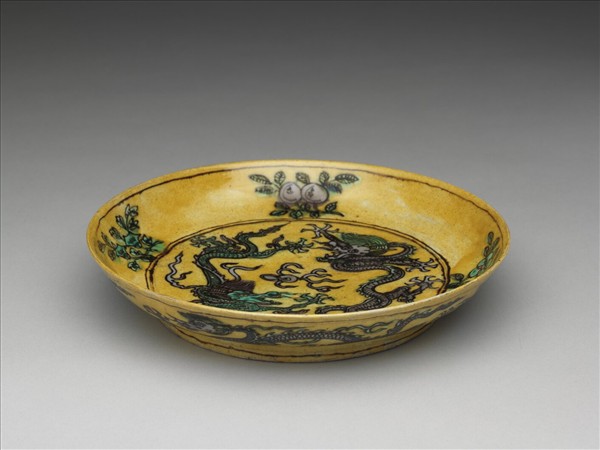 素三彩黃地花果龍紋盤