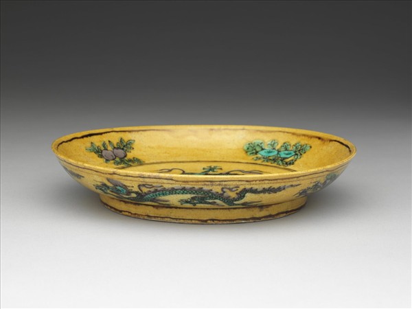 侈口,淺壁,矮圈足。薄胎骨,全器施嬌黃釉,盤心彩畫雙龍戲珠紋,內壁畫花卉及桃實各二析枝,加飾赭色線三道。外壁彩畫龍紋四條,加飾赭色線三道。底有赭色書「大明萬曆年製」六字二行楷款,外加雙圈。