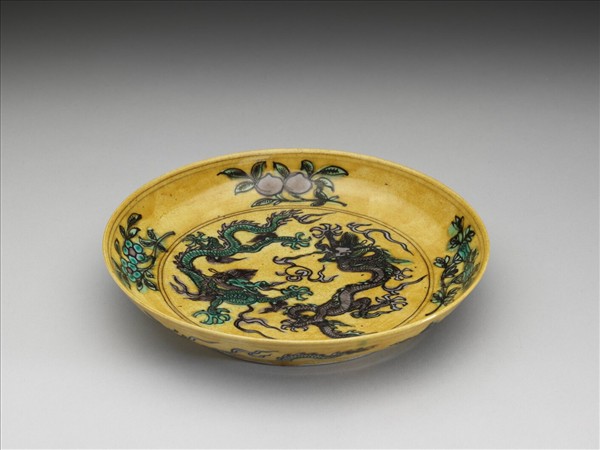 素三彩黃地花果龍紋盤