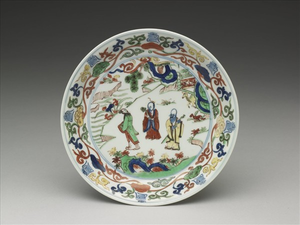 侈口窄唇,淺壁,矮圈足。厚胎白釉。盤心彩畫山水及福祿壽三星,周壁彩畫轉枝靈芝,加書青壽字。外壁彩畫折枝松竹梅八枝。足圈彩畫轉枝花葉圖案。口足內外加飾青線六道。底有青花書「大明萬曆年製」六楷字款,外加雙圈。