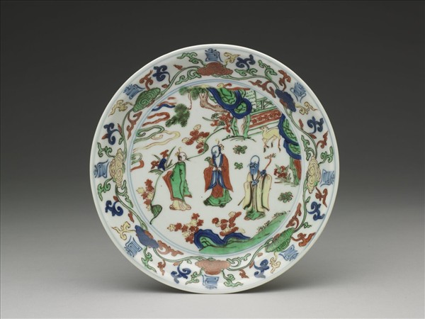 這件五彩福祿壽三星盤,器形略外侈、淺壁、矮圈足。盤心繪有福、祿、壽三星立於五彩祥雲及奇花樹石之間,器內壁繪八朵轉枝靈芝,靈芝上並以青料書有「壽」字。器外壁繪有折枝松竹梅八枝。足圈彩畫轉枝花葉圖案。外底有「大明萬曆年製」青花楷書雙圈款。盤面上由左至右可以看到身著綠衣,往後回首的是福星,身著紅衣,手持如意的是祿星,身著黃衣,高額長鬚的則是壽星。三星的主題的出現,除了反映人們對美好人生的嚮往及期待,也沿續了明代嘉靖時期以來描繪吉祥或仙人等佛、道紋樣於瓷器上的現象。