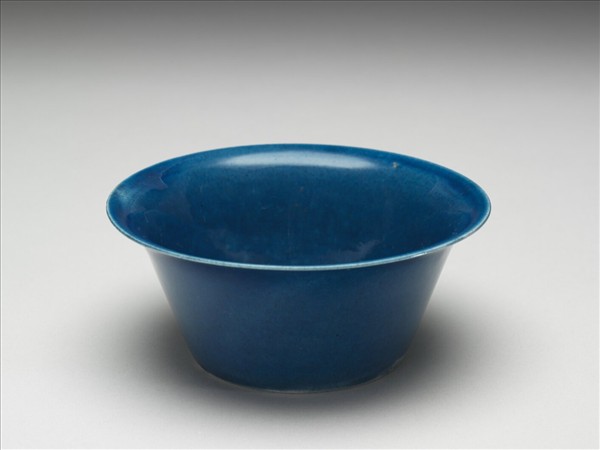 撇口、斜直壁、平底、淺圈足內凹。全器薄胎無紋,施霽青釉,僅足圈無釉。器底刻劃「大明嘉靖年製」楷體六字雙圈款。