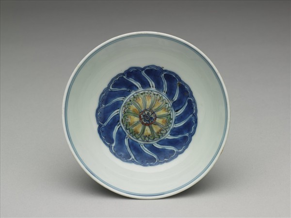 廣口碗,侈口、弧形壁、圈足,足內底心凸出,通稱雞心碗。碗心彩繪花朵兩圈,呈放射狀。腹外壁彩繪六折枝石榴、小花。底邊有三層波濤紋。口沿內外各青線二道,圈足青線一道。器底青花書雙圈「大明嘉靖年製」楷體六字款。