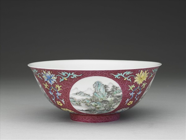 撇口碗,深弧壁,矮圈足。器內純白釉,內底心飾琺瑯彩描金八瓣圖案花;外壁及圈足紫紅地上錐剔鳳尾形卷草錦地紋,四圓形開光內,分別以墨彩及彩繪畫四季山水,開光之間鉤繪圖案式洋花。外底心書「大清乾隆年製」三行青花篆款。