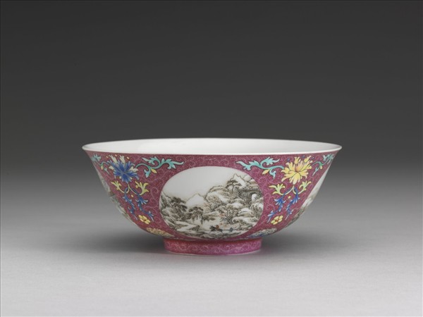 撇口碗,深弧壁,矮圈足。器內純白釉,內底心飾琺瑯彩描金八瓣圖案花;外壁及圈足紫紅地上錐剔鳳尾形卷草錦地紋,四圓形開光內,分別以墨彩及彩繪畫四季山水,開光之間鉤繪圖案式洋花。外底心書「大清乾隆年製」三行青花篆款。