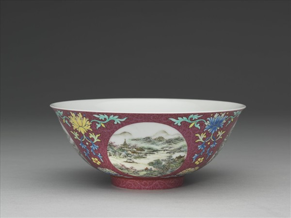 琺瑯彩洋紅地開光四季山水圖碗