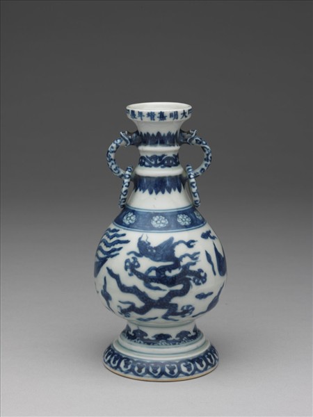 瓶,斂口窄邊,三節長頸,梨形腹,高足外侈,頸飾兩獸耳活環。薄胎骨,釉色瑩白。頸上下端畫青花蕉葉紋各一層,中畫青花勾雲紋一圈,耳上繪卷草,肩繪團花紋一圈,腹部畫青花龍鳳各一對,足上畫雲頭紋及蓮瓣紋一圈。外口沿下書「大明嘉靖年製」青花楷書橫款。