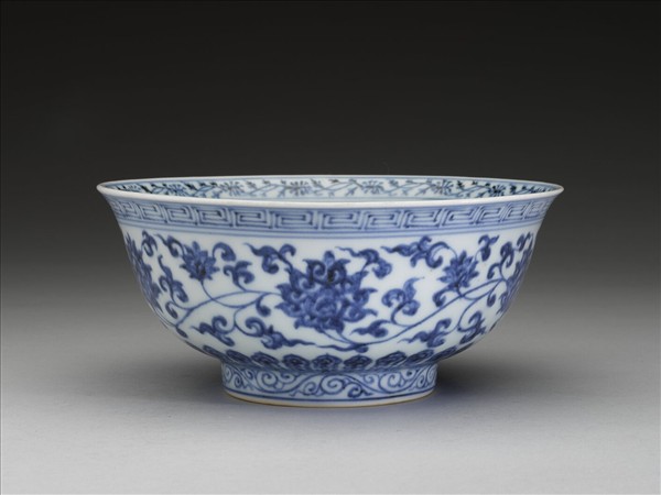 侈口窄唇,深壁,矮圈足。碗內口唇上畫轉枝菊花一週,內壁畫纏枝四季花五朵,碗心畫番蓮一枝。外面口沿下畫回紋一道,週壁畫纏枝番蓮五朵,底邊畫蓮瓣紋,足圈畫卷草紋。內外花紋間加飾青線十一道。底有青花書「大明宣德年製」六字二行楷款,外加雙圈。