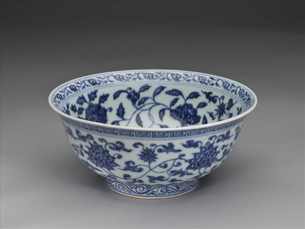 侈口窄唇,深壁,矮圈足。碗內口唇上畫轉枝菊花一週,內壁畫纏枝四季花五朵,碗心畫番蓮一枝。外面口沿下畫回紋一道,週壁畫纏枝番蓮五朵,底邊畫蓮瓣紋,足圈畫卷草紋。內外花紋間加飾青線十一道。底有青花書「大明宣德年製」六字二行楷款,外加雙圈。