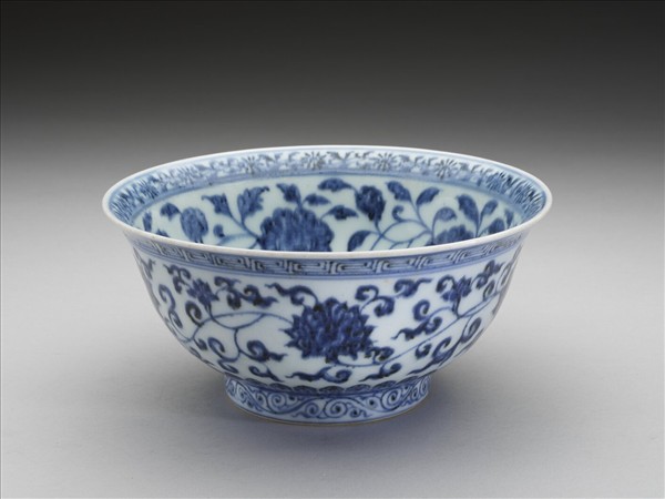 侈口窄唇,深壁,矮圈足。碗內口唇上畫轉枝菊花一週,內壁畫纏枝四季花五朵,碗心畫番蓮一枝。外面口沿下畫回紋一道,週壁畫纏枝番蓮五朵,底邊畫蓮瓣紋,足圈畫卷草紋。內外花紋間加飾青線十一道。底有青花書「大明宣德年製」六字二行楷款,外加雙圈。