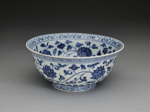 侈口窄唇,深壁,矮圈足。碗內口唇上畫轉枝菊花一週,內壁畫纏枝四季花五朵,碗心畫番蓮一枝。外面口沿下畫回紋一道,週壁畫纏枝番蓮五朵,底邊畫蓮瓣紋,足圈畫卷草紋。內外花紋間加飾青線十一道。底有青花書「大明宣德年製」六字二行楷款,外加雙圈。