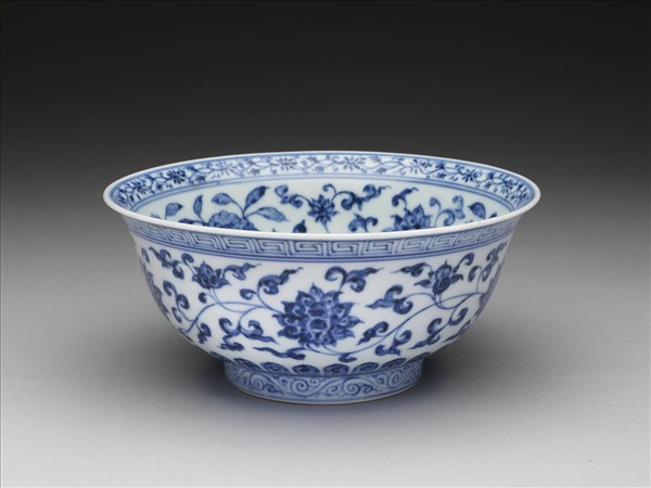 侈口窄唇,深壁,矮圈足。碗內口唇上畫轉枝菊花一週,內壁畫纏枝四季花五朵,碗心畫番蓮一枝。外面口沿下畫回紋一道,週壁畫纏枝番蓮五朵,底邊畫蓮瓣紋,足圈畫卷草紋。內外花紋間加飾青線十一道。底有青花書「大明宣德年製」六字二行楷款,外加雙圈。