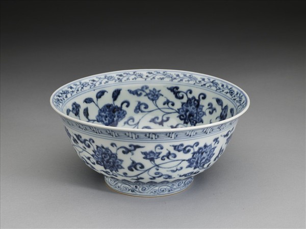 侈口窄唇,深壁,矮圈足。碗內口唇上畫轉枝菊花一週,內壁畫纏枝四季花五朵,碗心畫番蓮一枝。外面口沿下畫回紋一道,週壁畫纏枝番蓮五朵,底邊畫蓮瓣紋,足圈畫卷草紋。內外花紋間加飾青線十一道。底有青花書「大明宣德年製」六字二行楷款,外加雙圈。