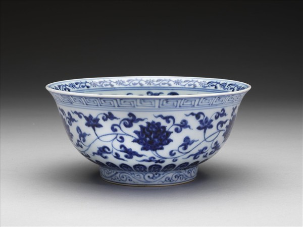 侈口窄唇,深壁,矮圈足。碗內口唇上畫轉枝菊花一週,內壁畫纏枝四季花五朵,碗心畫番蓮一枝。外面口沿下畫回紋一道,週壁畫纏枝番蓮五朵,底邊畫蓮瓣紋,足圈畫卷草紋。內外花紋間加飾青線十一道。底有青花書「大明宣德年製」六字二行楷款,外加雙圈。