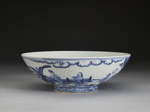 侈口,淺壁,矮圈足。外壁畫仕女、庭園及山景,足圈畫卷草紋一道。口足間加飾青線六線。內面純白,樸素無紋飾。底有青花書「大明宣德年製」二行六字楷款,外加雙圈。
