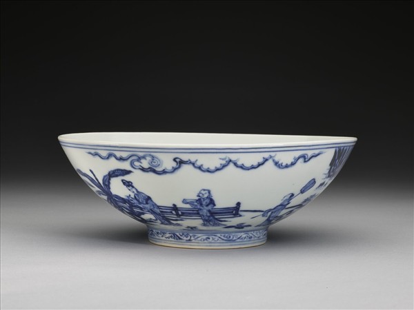 侈口,淺壁,矮圈足。外壁畫仕女、庭園及山景,足圈畫卷草紋一道。口足間加飾青線六線。內面純白,樸素無紋飾。底有青花書「大明宣德年製」二行六字楷款,外加雙圈。