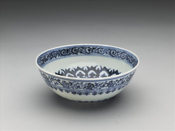 侈口,深壁弧形,凸底,矮圈足。內壁畫卷草紋與桃形圖案各一周,碗心畫四連桃形圖案一枚,外飾纏枝花卉紋一周。外壁口沿下畫纏枝花卉二道,底邊畫蓮瓣紋。內外花紋間加飾青線十二道。