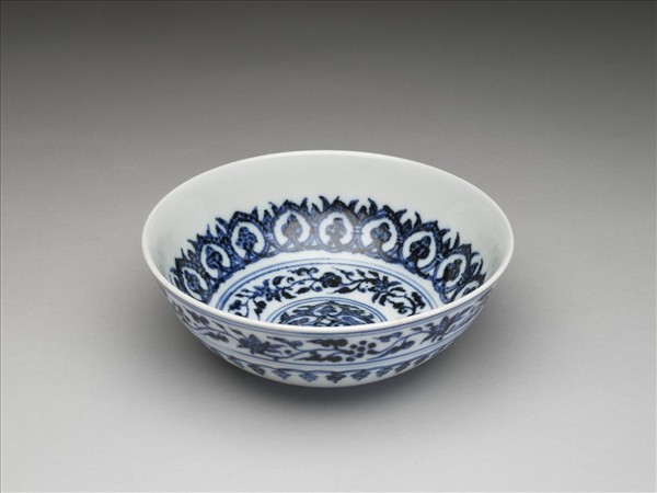 侈口,深壁弧形,凸底,矮圈足。內壁畫花卉及桃形圖案各一周,碗心畫四連桃形圖案一枚,加飾青線四道。外壁畫纏枝花卉及垂果圖案各一周,加飾青線四道。