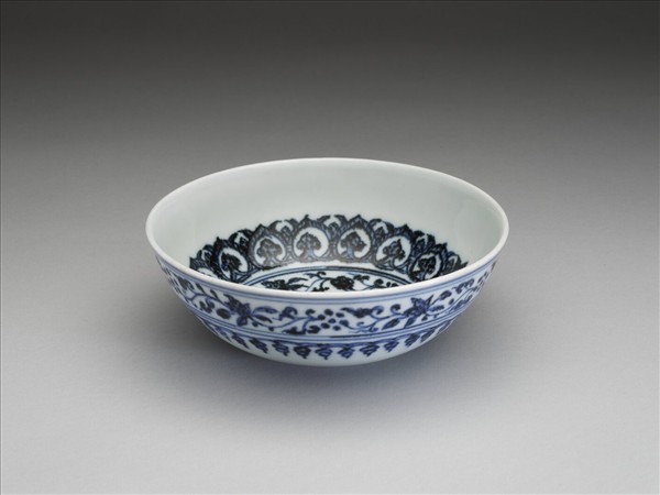 侈口,深壁弧形,凸底,矮圈足。內壁畫花卉及桃形圖案各一周,碗心畫四連桃形圖案一枚,加飾青線四道。外壁畫纏枝花卉及垂果圖案各一周,加飾青線四道。