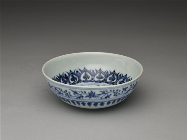 侈口,深壁弧形,凸底,矮圈足。內壁畫花卉及桃形圖案各一周,碗心畫四連桃形圖案一枚,加飾青線四道。外壁畫纏枝花卉及垂果圖案各一周,加飾青線四道。