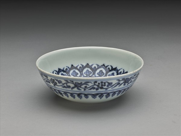 侈口,深壁弧形,凸底,矮圈足。內壁畫花卉及桃形圖案各一周,碗心畫四連桃形圖案一枚,加飾青線四道。外壁畫纏枝花卉及垂果圖案各一周,加飾青線四道。