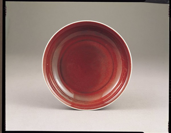 侈口,弧壁,平底,圈足。盤底內凹外凸。內外壁均施紅釉,底施白釉。內壁印飾雙龍趕珠紋,印紋稍深,凸起紋飾略見白筋,口足均露白邊,釉面多橘皮紋。胎質細膩潔白,胎釉間泛淺橘色。底青花書「大明宣德年製」二行六字楷款,外加雙青圈。