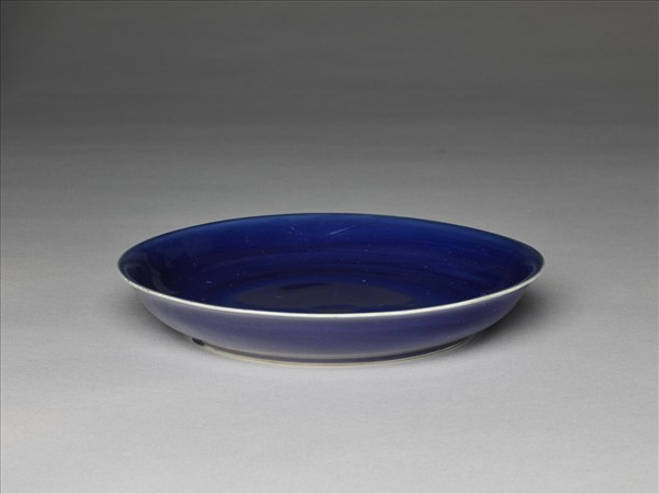 侈口窄唇,淺弧形壁,矮圈足。全器施霽青釉,施釉至足邊,口沿與足邊各留一道白邊,足緣無釉露白胎。足內壁及底施白釉,底有青花書「大明成化年製」六字二行楷款,外加雙圈。