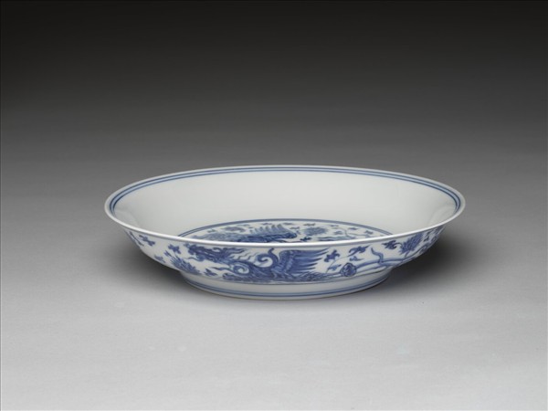 撇口窄唇,淺壁,圈足。以釉下青花繪飾,外壁繪鳳凰一對,間飾纏枝番蓮花。內壁素白無紋,盤心畫雙鳳穿蓮。內外共飾青線八道。底青花書「大明成化年製」雙圈六字楷款。