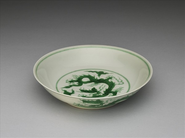 侈口,淺壁弧形,矮圈足。盤心與外壁刻畫雲龍三條,外壁隙地淺劃雙珠、波濤紋。薄胎白釉,龍紋加填綠彩,口足內外分畫綠線四道。底有青花書「大明弘治年製」二行六字楷款,外加雙圈。