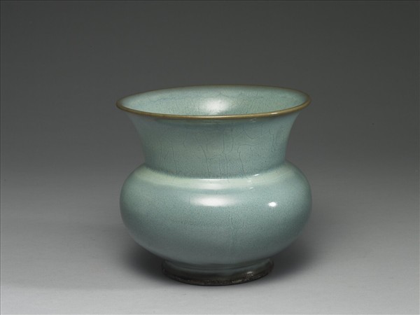 造型仿古銅器,作渣斗型。侈口外敞,長頸,扁圓腹,底挖五孔,矮圈足。通體罩施月白色釉,釉色泛青,胎厚釉濃,釉面清澈明亮。頸部釉面滿佈蚯蚓走泥紋,口沿呈褐色邊。施釉至足際,足脛修釉邊,釉彩局部剝落。足底緣修飾平整,露胎處塗醬色護胎釉,底印數目字「六」,並有清宮所刻「建福宮敬勝齋樓下用」的款記。