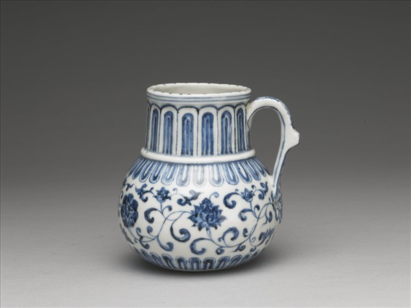 此器直口,長頸,豐腹,底微凹,一側接有一寬帶把柄,跨越頸和腹之間,器形即所謂的「花澆」、「水注」或「執壺」。此類器形應該來自外地,西亞地區出現不少與之相似的銀、銅、陶器,這類器物經常被穆斯林當作淨手或澆花之用。此器表面為白底青花,唯底部無釉,露出胎土。此器口緣有一圈點狀紋,頸部和腹部上、下各有一圈蓮瓣紋,腹部兩道蓮瓣紋之間則有纏枝牡丹紋,把手上亦有蔓草紋,自上而下層層裝飾。值得注意的是,器表的青花紋樣出現「滲青」現象,即鈷藍釉料未研磨精細,在窯燒時不能完全燒熔,故形成粒子般的小青點所致,乃宣德青花常見的特色。另外,器腹上有「大明宣德年製」六字楷款,並附上二張黃籤,一張書有「青花白地瓷花澆一件」和「 紫檀座宣德款」二句,另一張則書有「寶座床西旁設」、「 青花白地磁花洗一件」和「隨座」三句。