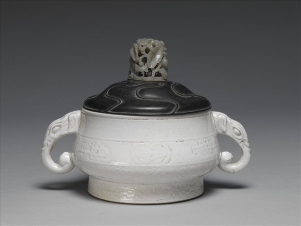 器型仿銅簋,斂口、夸腹、圈足稍高。兩側貼飾象耳。腹部淺浮雕夔紋四(局部)及獸面紋二隙地滿印回紋,上下各有弦紋一道,腹部下方為如意雲頭紋一周。足圈外側淺浮雕獸面紋二枚,獸面紋左右兩側各有夔紋一。隙地滿印回紋。全器滿釉,釉面光潤,有大小紋片。紋片呈淡黃色。在口沿下及象耳邊緣均有縮釉的情形,器底釉面多細小的砂眼,及釉裂的現象。足圈露胎,質細膩。足圈外側加鏇一周。器底有清宮黃紙籤:「寶座床西旁設,定磁象耳爐一件,蓋嵌玉」原定名「元臨川窯牙白印花夔紋象耳爐」。