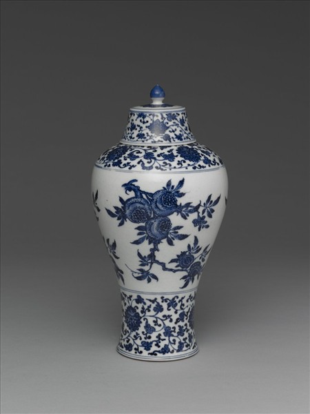 小口圓唇短頸,聳圓豐肩,腹身修長向下收斂至足脛外撇,底內挖為淺圈足,帶尖頂蓋。瓶頸畫青花雲紋與如意雲各一道,器肩上畫纏枝番蓮紋一週,器腹部畫青花石榴、桃實,桃實益壽,石榴多子,故以此寓意「多壽、多子」,常與「福」發音相似,象徵「多福」的佛手柑合稱「三多」;瓶的足脛畫纏枝番蓮花,全器頸、肩、腹、足各處週畫旋紋分隔。蓋面畫如意雲紋,週畫纏枝番蓮紋,蓋頂全部染青,蓋上各處紋飾間亦加飾青花旋紋分隔。胎質較薄,白地釉色瑩白。