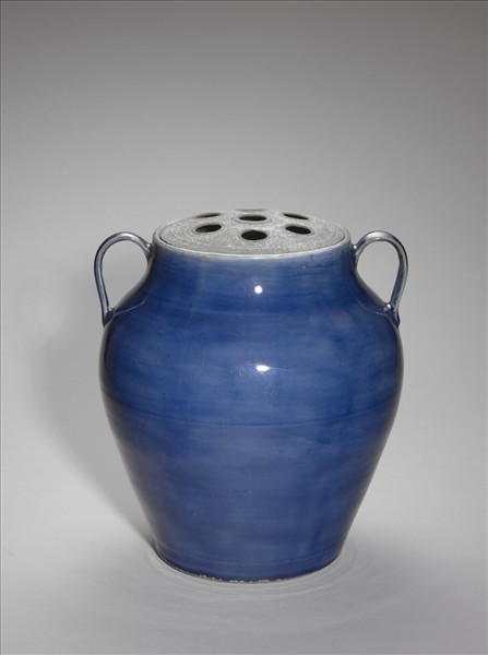 斂口短頸,器腹部上豐下斂,淺圈足,頸兩側飾兩弓形耳。胎骨厚重,外壁滿施霽藍色釉,器表見有摩擦痕,外底未上釉,微見火石紅與墊砂痕。附金屬膽。