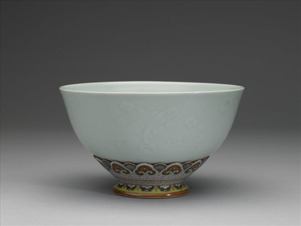 均侈口,深壁,蓮瓣紋圈足。胎骨厚重,碗壁滿施淺青釉,外面錐拱魚藻紋,內面樸素無紋飾。碗足上部刻蓮瓣紋,可以旋轉,彩畫如意雲、錦花,加描金線。底均有青花書「大清乾隆年製」六篆字款。