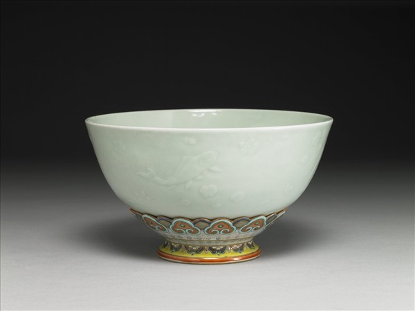碗為侈口、深壁,底接台座,座底有青花書「大清乾隆年製」六字篆款。碗內、外分施冬青色釉,弧形碗壁錐拱出魚藻紋,底座施黃釉,釉面以褐、紅、綠、藍等釉,再描繪蓮瓣紋、如意雲紋及錦花,圖案加金邊,使之產生有如同金屬器般的質感。碗與座皆各自成形、燒造,再以卡榫相接成可以把玩、賞析的轉足碗。唐英於乾隆八年(1743)進呈的瓷器中,即包含一件「冬青有座轉旋靶碗」。雖然檔案僅止於品名的記載,然而對照實物,無論如何都讓人產生與此件作品的聯想。