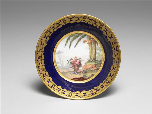 藍地描金五彩花籃徽記碟
