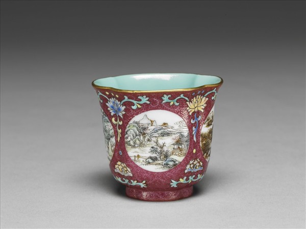 杯撇口,深腹,圈足。外壁及圈足均為紫紅地錐剔鳳尾形卷草錦地紋,餘隙二圓形開光內,分別以墨彩及彩繪畫四季山水畫,開光之間鉤繪圖案式洋花。口足描金,杯內及底施湖綠釉,底心白地框內青花書「乾隆年製」四字二行篆款。