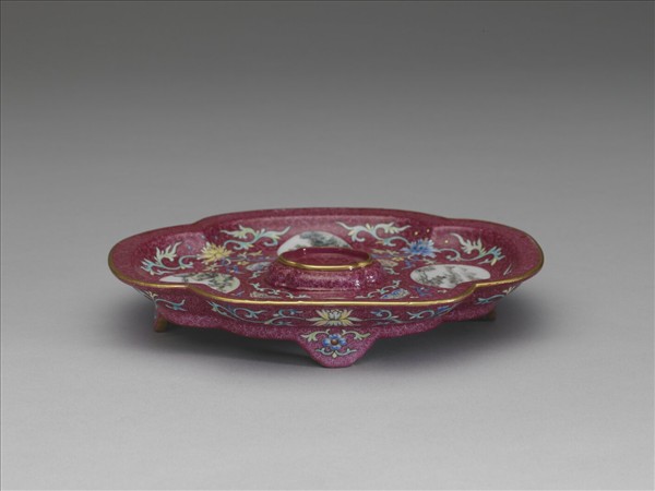 盤折沿,淺壁,盤心凸出海棠形托圈,周凸內凹可以套合杯,海棠形圈足,中出四墊足。盤內及外壁為紫紅地錦上添花紋飾,環繞凸圈為四開光四季山水畫,開光之間鉤繪圖案式洋花;外壁則為錦上添花纏枝蓮紋。除底心留白框內青花書「乾隆年製」四字二行篆款,餘隙地全施湖綠釉,圍繞款識一周有四支釘痕,口沿足底均以金彩描繪。