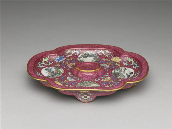 盤折沿,淺壁,盤心凸出海棠形托圈,周凸內凹可以套合杯,海棠形圈足,中出四墊足。盤內及外壁為紫紅地錦上添花紋飾,環繞凸圈為四開光四季山水畫,開光之間鉤繪圖案式洋花;外壁則為錦上添花纏枝蓮紋。除底心留白框內青花書「乾隆年製」四字二行篆款,餘隙地全施湖綠釉,圍繞款識一周有四支釘痕,口沿足底均以金彩描繪。