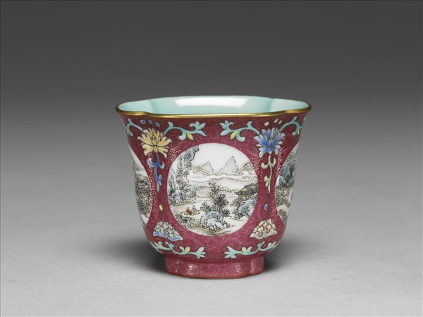 杯撇口,深腹,圈足。外壁及圈足均為紫紅地錐剔鳳尾形卷草錦地紋,餘隙二圓形開光內,分別以墨彩及彩繪畫四季山水畫,開光之間鉤繪圖案式洋花。口足描金,杯內及底施湖綠釉,底心白地框內青花書「乾隆年製」四字二行篆款。