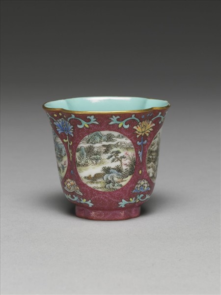 杯撇口,深腹,圈足。外壁及圈足均為紫紅地錐剔鳳尾形卷草錦地紋,餘隙二圓形開光內,分別以墨彩及彩繪畫四季山水畫,開光之間鉤繪圖案式洋花。口足描金,杯內及底施湖綠釉,底心白地框內青花書「乾隆年製」四字二行篆款。