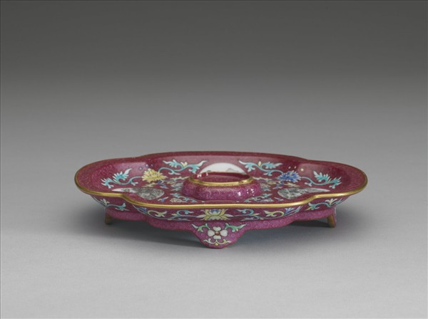 盤折沿,淺壁,盤心凸出海棠形托圈,周凸內凹可以套合杯,海棠形圈足,中出四墊足。盤內及外壁為紫紅地錦上添花紋飾,環繞凸圈為四開光四季山水畫,開光之間鉤繪圖案式洋花;外壁則為錦上添花纏枝蓮紋。除底心留白框內青花書「乾隆年製」四字二行篆款,餘隙地全施湖綠釉,圍繞款識一周有四支釘痕,口沿足底均以金彩描繪。