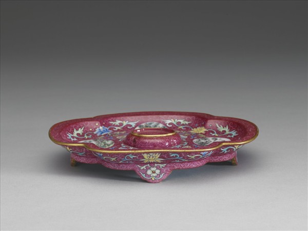 盤折沿,淺壁,盤心凸出海棠形托圈,周凸內凹可以套合杯,海棠形圈足,中出四墊足。盤內及外壁為紫紅地錦上添花紋飾,環繞凸圈為四開光四季山水畫,開光之間鉤繪圖案式洋花;外壁則為錦上添花纏枝蓮紋。除底心留白框內青花書「乾隆年製」四字二行篆款,餘隙地全施湖綠釉,圍繞款識一周有四支釘痕,口沿足底均以金彩描繪。