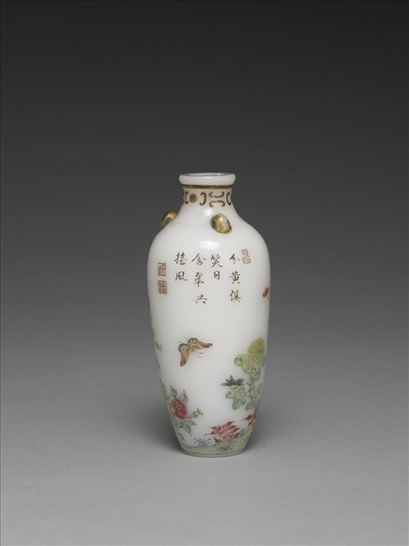 短頸斜肩半透明白色玻璃小瓶,肩部有描金三繫鈕。頸部飾描金勾連雲紋,腹部繪山石、叢菊、月季、雁來紅,並有彩蝶飛舞其間。瑩潤白地上有墨書:「分黃俱笑日 含翠共搖風」,及「佳麗」、「四時」、「長春」三枚篆體朱文印,詩句出自唐 駱賓王〈秋晨同湽川毛司馬秋九詠 秋菊〉。院藏〈清 雍正瓷胎畫琺瑯菊花鍾〉亦可見相同題詠,墨書字體及「佳麗」朱印亦相近。唯此件墨色略淡,花卉山石色彩則更為豐富且具暈染層次。枯枝殘葉,尤見線條靈動,體現結合詩書畫印於一體之玻璃藝術。